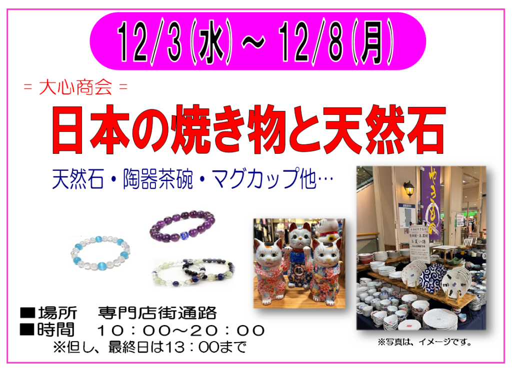 【終了】12/3~12/8 日本の焼き物と天然石 開催!